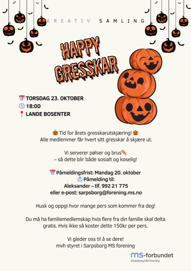 Hjem / Arrangementer / Kreativ samlingKreativ samling Vi skjærer ut fine gresskar til halloween! LokasjonSarpsborg Type Sosialt Dato23.10.2025 kl. 18:00PrisGratis for medlemmer Arrangør Sarpsborg MS-forening