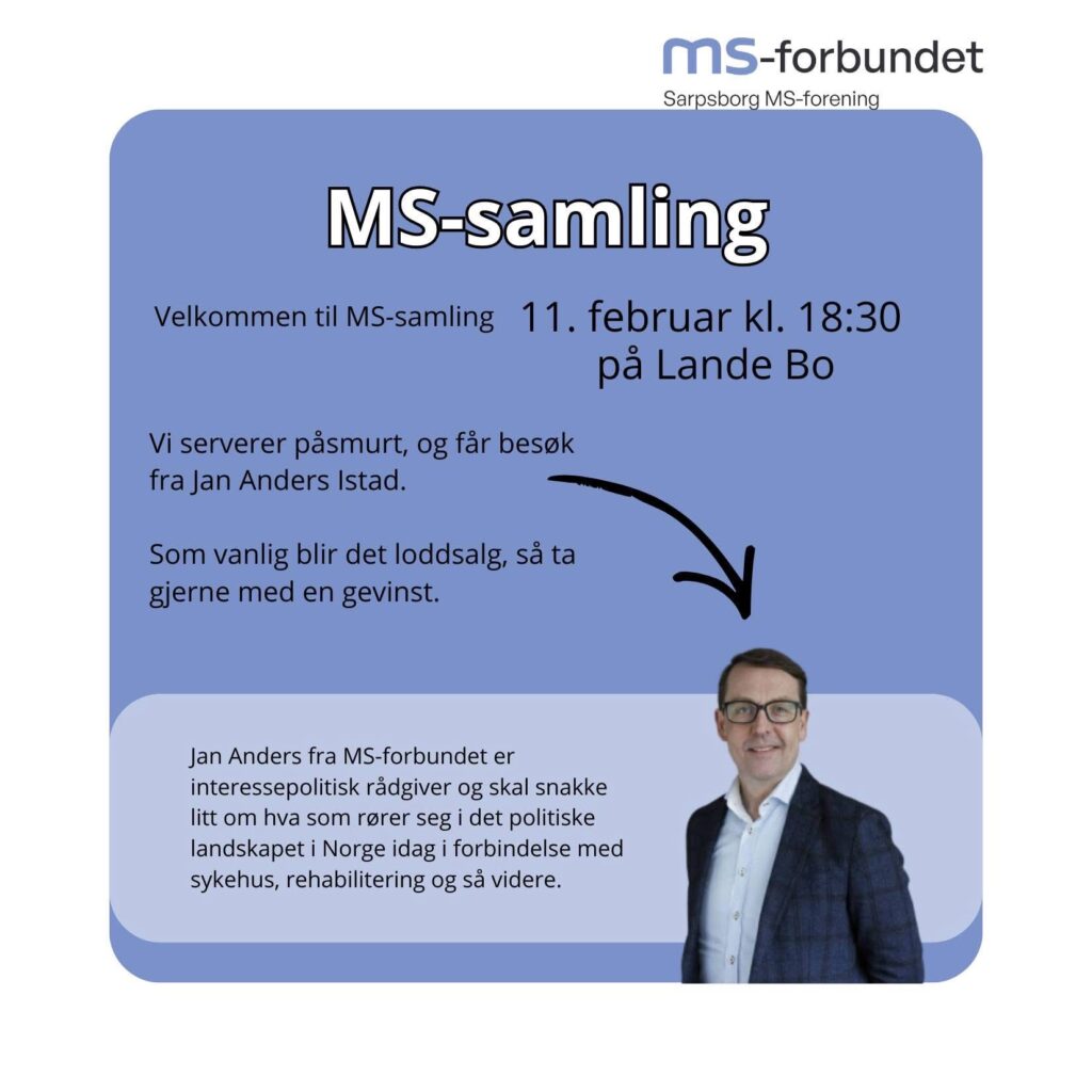 Hjem / Arrangementer / MS-samlingMS-samling Vi får besøk av interessepolitisk rådgiver Jan-Anders fra MS forbundet Type Dato11.02.2026 kl. 18:3013:00 Registrer deg