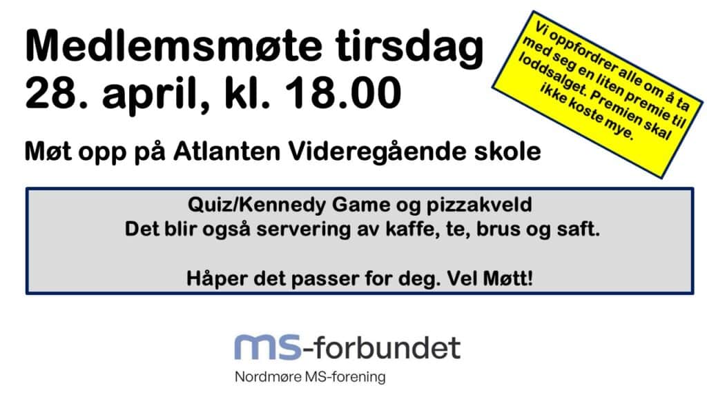 Vi møtes vanligvis i Kristiansund. En gang i året prøver vi å arrangere medlemsmøte et annet sted på Nordmøre. På noen medlemsmøter tas temaer opp som direkte eller indirekte berører oss med MS eller våre pårørende, mens det andre ganger kun er sosialt. Mer info om våre medlemsmøter finner du på vår Facebook-side, Nordmøre MS-forening.