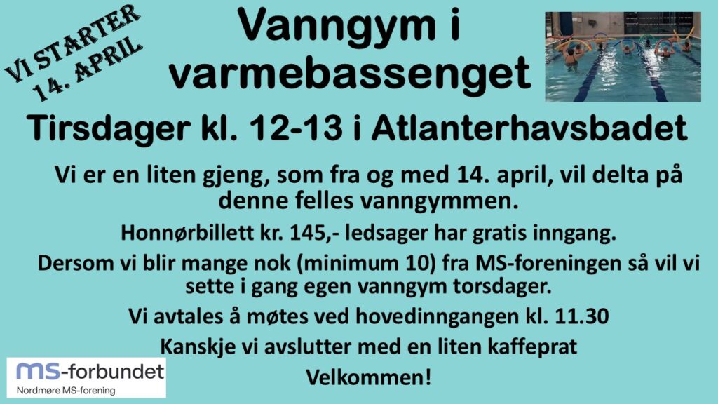 - 14. april: Vanngym i varmebassenget i Atlanterhavsbadet, kl. 12-13